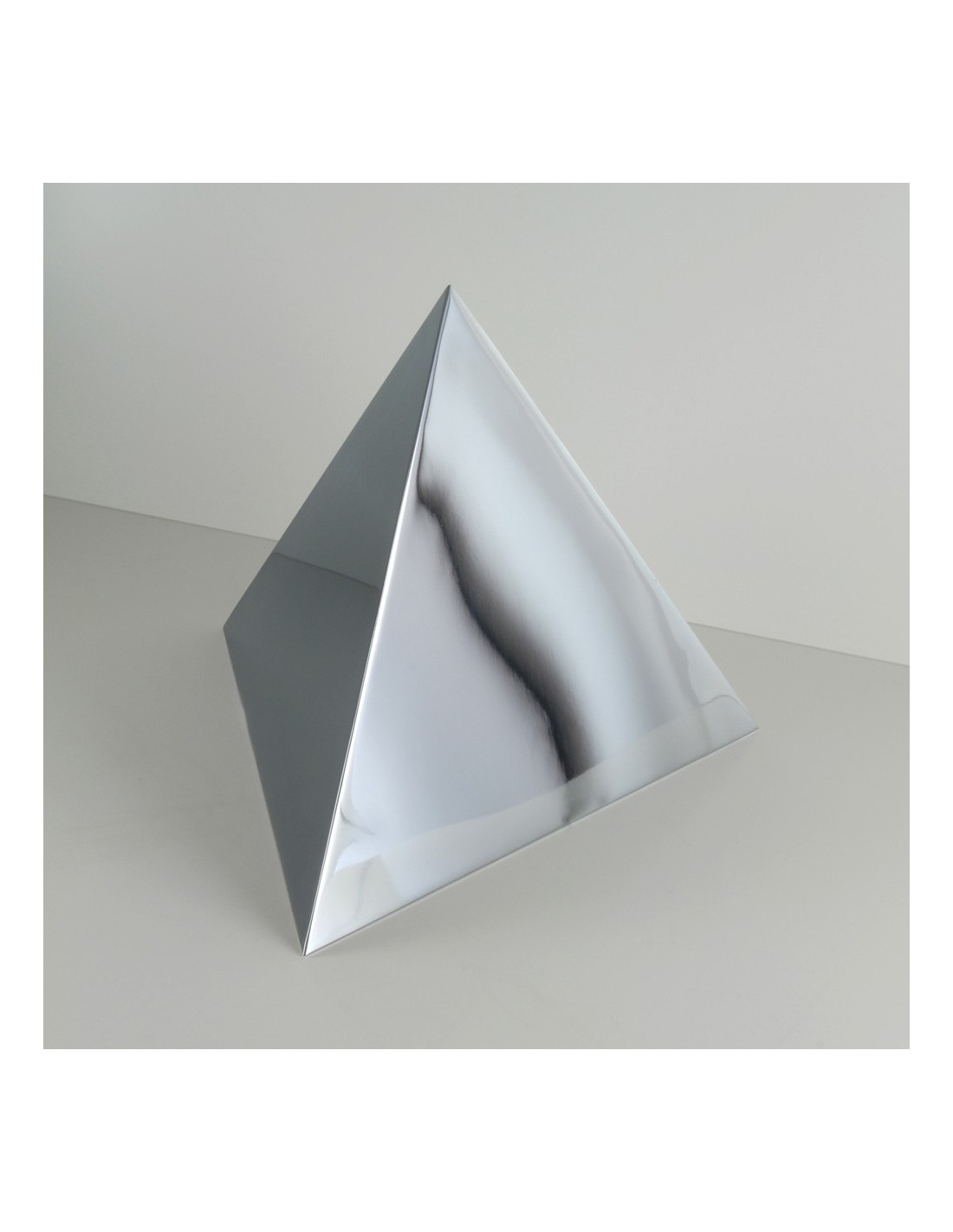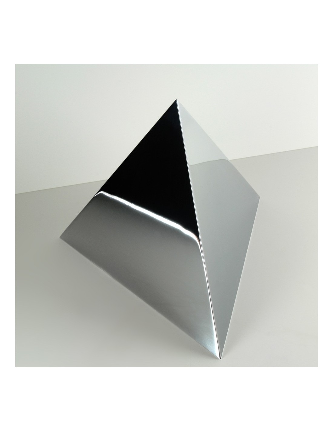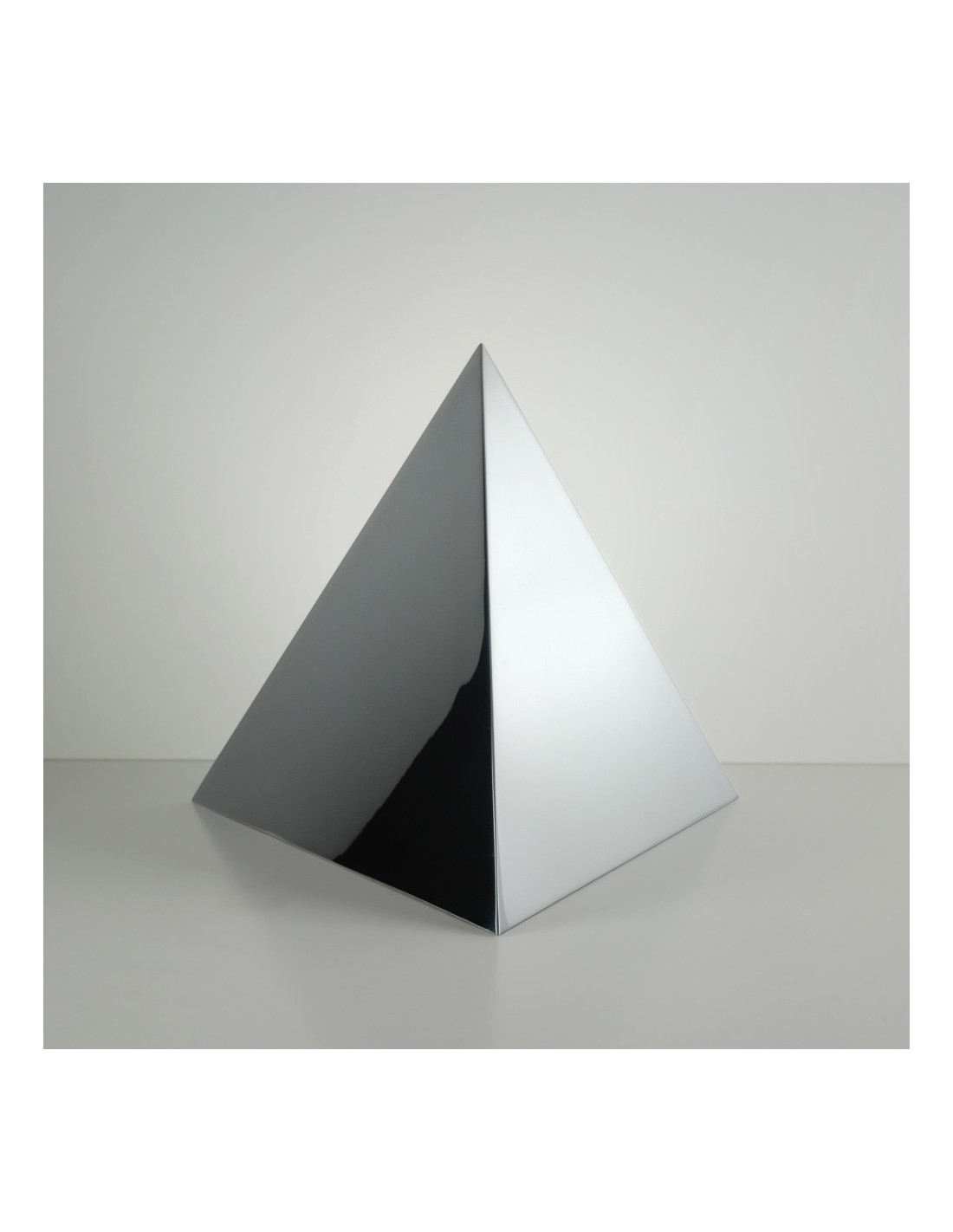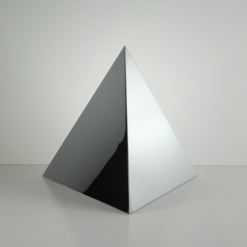 En la tradición, la base de la pirámide representa la Tierra, mientras el vértice, el Cielo. Hemos aplicado a esta urna para cenizas, cargada de simbolismo, un acabado pulido brillante que le otorga una espectacular presencia.