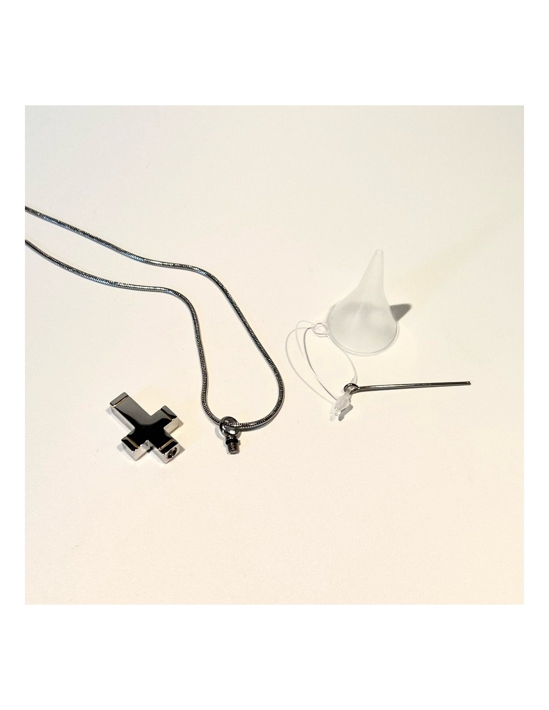 Símbolo inalterable, este colgante fabricado en acero inoxidable plateado evoca la memoria eterna de los seres queridos. Es un crucifijo de acabado brillante con ribetes decorativos que permite guardar una pequeña porción de cenizas en su interior.